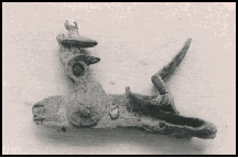 Niet ver van de monding van deze kreek staken wij nogmaals over en liepen langs de oever van de Suriname rivier terug, richting kamp. Het was duidelijk dat er hier veel landafslag had plaatsgevonden en op de plaats waar er duidelijk bauxiet in de oever te zien was, kon je rode bakstenen in de steile oever zien. Hier vonden wij ook een stukje lood dat onder water lag.