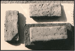 punt van de baai vonden we enkele kleinere bakstenen. De tot nu toe gevonden bakstenen waren 10x20x4 cm groot, terwijl de kleine 7x10x3 cm groot waren. Van deze kleintjes vonden we slechts enkele en de afmetingen waren zeker niet het gevolg van slijtage door zand en water omdat de randen er niet afgesleten uitzagen. Zijn dit bakstenen gemaakt met een speciaal doel, of zijn dit veel oudere bakstenen uit de tijd van Torarica? Opvallend was ook dat de ene zijde licht hol en de andere zijde licht bol was. Waarom?